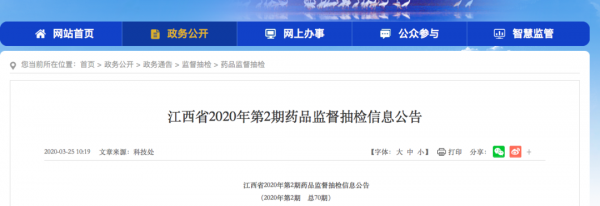 近日,江西省藥品監(jiān)督管理局網(wǎng)站發(fā)布《江西省2020年第2期藥品監(jiān)督抽檢信息公告》。