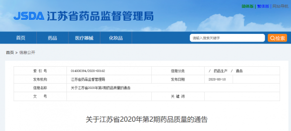 8月10日,江蘇省藥監(jiān)局發(fā)布了“2020年第2期藥品質(zhì)量的通告”(以下簡(jiǎn)稱“通告”)。