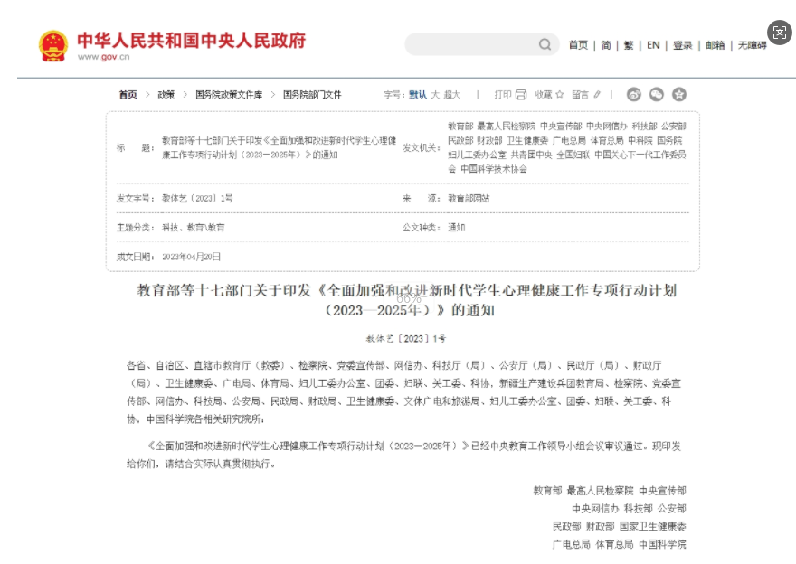 促進(jìn)學(xué)生身心健康、全面發(fā)展,已經(jīng)成為群眾關(guān)切、社會(huì)關(guān)注的重大課題。實(shí)際上,黨和國(guó)家一直以來(lái)高度重視學(xué)生心理健康問(wèn)題,采取了一系列措施,發(fā)布了諸多文件,守護(hù)年輕一代健康成長(zhǎng)。黨的二十大報(bào)告就明確提出,重視心理健康和精神衛(wèi)生。2023年4月,教育部等十七部門(mén)印發(fā)《全面加強(qiáng)和改進(jìn)新時(shí)代學(xué)生心理健康工作專(zhuān)項(xiàng)行動(dòng)計(jì)劃(2023—2025年)》。