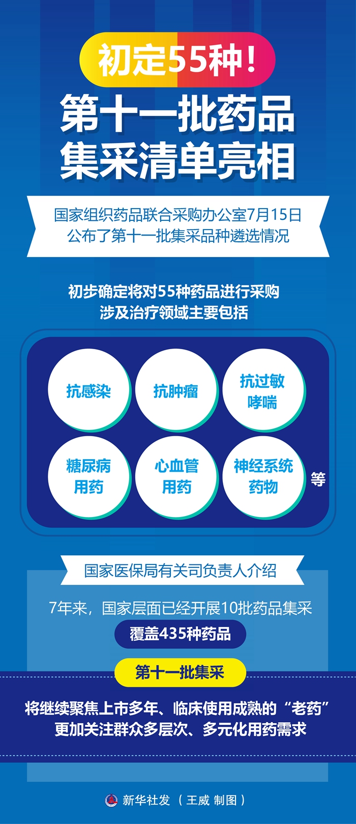 國(guó)家組織藥品聯(lián)合采購(gòu)辦公室7月15日公布了第十一批集采品種遴選情況,初步確定將對(duì)55種藥品進(jìn)行采購(gòu),涉及治療領(lǐng)域主要包括抗感染、抗腫瘤、抗過(guò)敏哮喘、糖尿病用藥、心血管用藥、神經(jīng)系統(tǒng)藥物等。