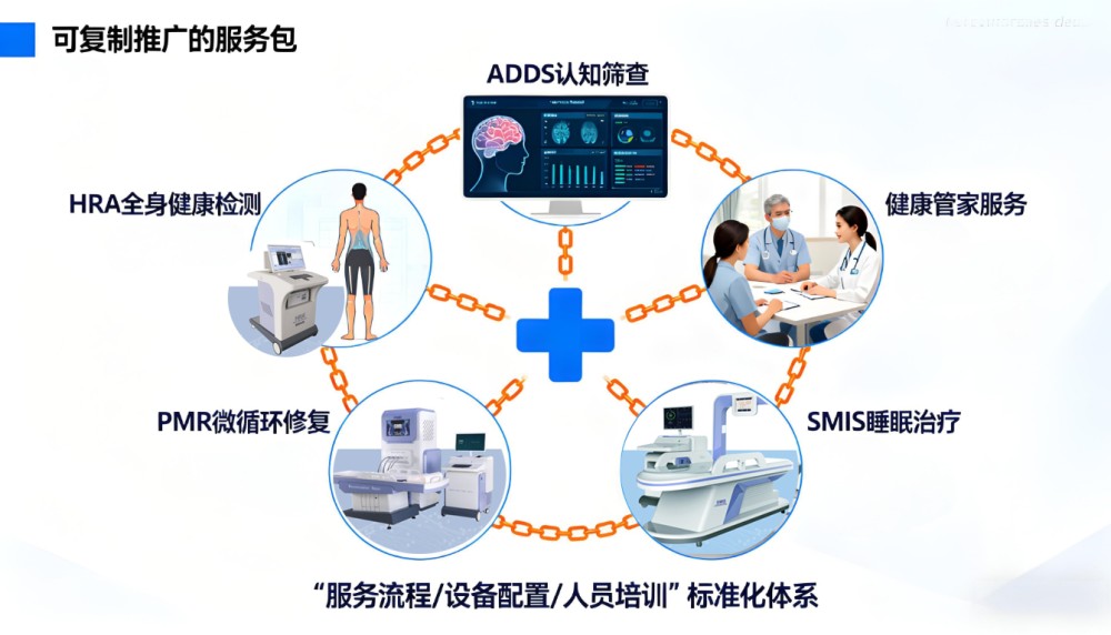 更重要的是,這種模式并非局限于某些社區(qū)的嘗試,而是形成了可復(fù)制、可推廣的標(biāo)準(zhǔn)化產(chǎn)品——“健康服務(wù)包”。“健康服務(wù)包”整合了HRA全身健康檢測(cè)、ADDS認(rèn)知篩查、健康管家服務(wù)、PMR微循環(huán)修復(fù)、SMIS睡眠治療等核心健康服務(wù)內(nèi)容,明確了服務(wù)流程、設(shè)備配置標(biāo)準(zhǔn)與人員培訓(xùn)體系,被眾多其他康養(yǎng)地產(chǎn)項(xiàng)目引入借鑒。