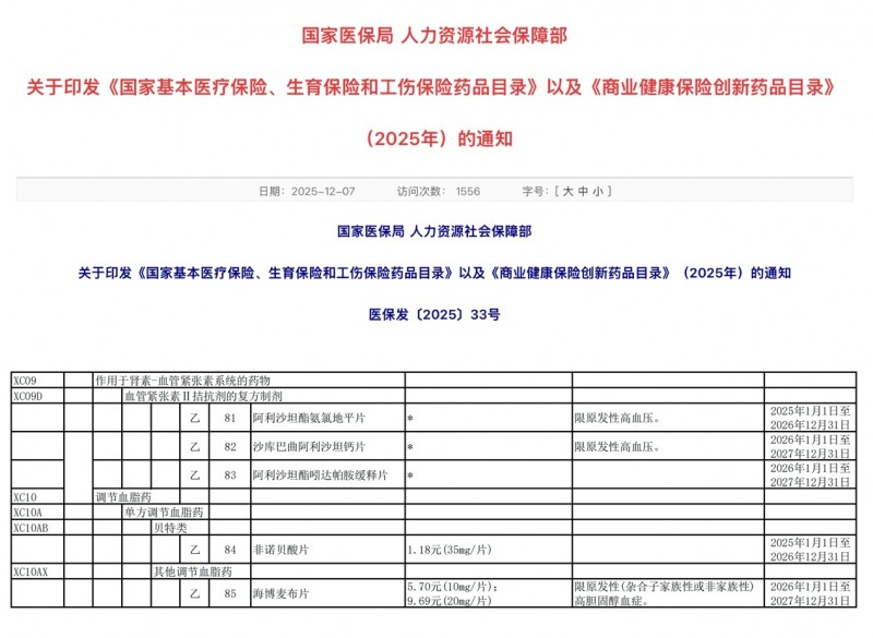 2025年12月7日,國(guó)家醫(yī)保局、人力資源社會(huì)保障部公布《國(guó)家基本醫(yī)療保險(xiǎn)、工傷保險(xiǎn)和生育保險(xiǎn)藥品目錄(2025年)》,信立泰自主研發(fā)的信超妥?(沙庫(kù)巴曲阿利沙坦鈣片)成功入選醫(yī)保。這款藥物是最新獲得《中國(guó)高血壓防治指南(2024年版)》推薦的國(guó)產(chǎn)原研新一類(lèi)降壓藥,全球第二款原研ARNI類(lèi)降壓藥。