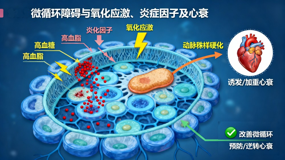 微循環(huán)障礙是心衰進展的核心機制之一。當心臟功能下降時,微血管網(wǎng)絡因血流減少、血管內皮損傷而功能失調,導致組織缺氧和代謝廢物堆積。這會進一步削弱心肌收縮力,形成“心衰—微循環(huán)障礙—心衰加重”的惡性循環(huán)。功能醫(yī)學研究發(fā)現(xiàn),微循環(huán)障礙還與氧化應激和炎癥因子釋放密切相關,例如,高血糖或高血脂環(huán)境會加劇血管內皮損傷,促進動脈粥樣硬化,最終誘發(fā)或加重心衰。因此,改善微循環(huán)成為預防和逆轉心衰的關鍵靶點。