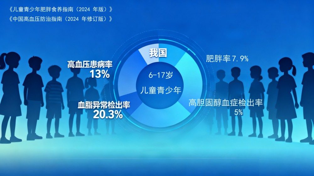 國家衛(wèi)生健康委發(fā)布的《兒童青少年肥胖食養(yǎng)指南(2024 年版)》顯示,我國6~17歲兒童青少年肥胖率已達 7.9%,成為誘發(fā)兒童代謝異常的首要因素?!吨袊哐獕悍乐沃改希?024 年修訂版)》數(shù)據(jù)顯示,6~17歲學(xué)齡兒童高血壓患病率已攀升至13%,相當于每7名兒童中就有1人存在血壓異常。首都兒科研究所的一項研究揭示,2017年北京市兒童青少年血脂異常檢出率達20.3%,高膽固醇血癥檢出率為5%。