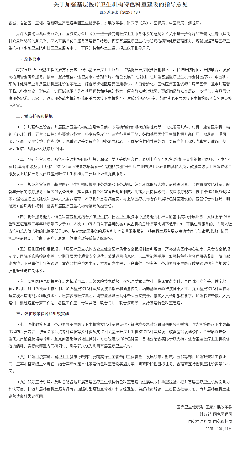 國家衛(wèi)健委聯(lián)合多部門發(fā)布《關(guān)于加強(qiáng)基層醫(yī)療衛(wèi)生機(jī)構(gòu)特色科室建設(shè)的指導(dǎo)意見》(國衛(wèi)基層發(fā)〔2025〕18號),明確提出到2030年,所有達(dá)到服務(wù)能力推薦標(biāo)準(zhǔn)的基層醫(yī)療衛(wèi)生機(jī)構(gòu)必須建成至少1個特色科室。