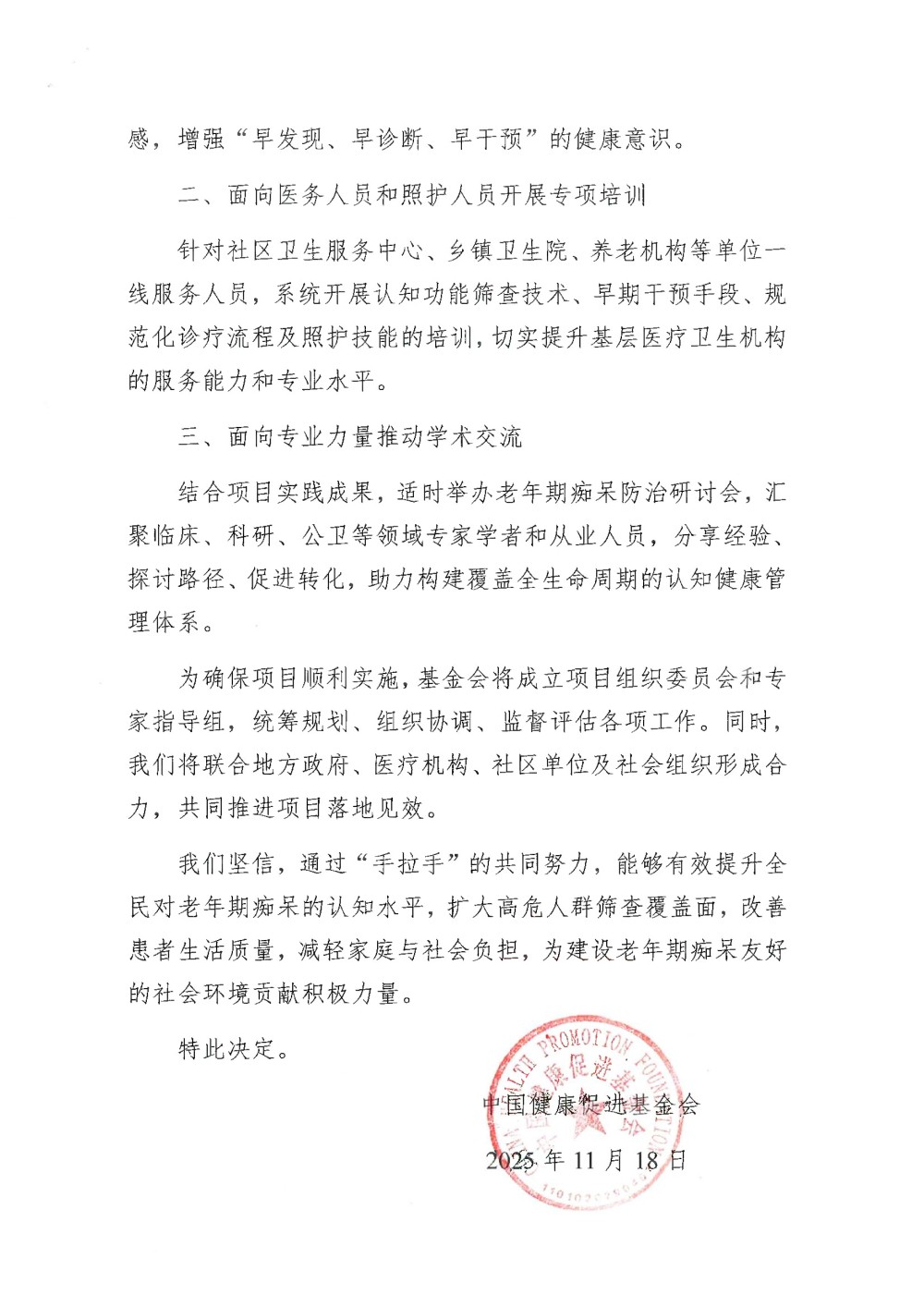 2025年11月18日,中國健康促進(jìn)基金會(huì)正式發(fā)布《關(guān)于組織開展“健康促進(jìn)手拉手——老年期癡呆防治宣教與培訓(xùn)公益活動(dòng)”的決定》(會(huì)字[2025]8號(hào)),宣布自2025年起在全國范圍內(nèi)啟動(dòng)老年期癡呆防治宣教與培訓(xùn)公益項(xiàng)目。