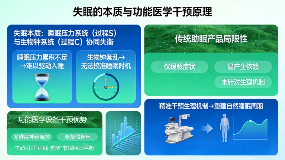 從睡眠科學(xué)視角來(lái)看,失眠的本質(zhì)是“睡眠壓力系統(tǒng)(過(guò)程S)”與“生物鐘系統(tǒng)(過(guò)程C)”的協(xié)同失衡——要么是睡眠壓力累積不足,難以驅(qū)動(dòng)入睡;要么是生物鐘紊亂,無(wú)法精準(zhǔn)校準(zhǔn)睡眠時(shí)機(jī)。傳統(tǒng)助眠產(chǎn)品的局限性,讓人們將目光投向了功能醫(yī)學(xué)領(lǐng)域的創(chuàng)新技術(shù)。臨床實(shí)踐證實(shí),搭載核心科技的功能醫(yī)學(xué)健康管理設(shè)備,能從生理機(jī)制層面精準(zhǔn)干預(yù),幫助人體重建自然睡眠周期。