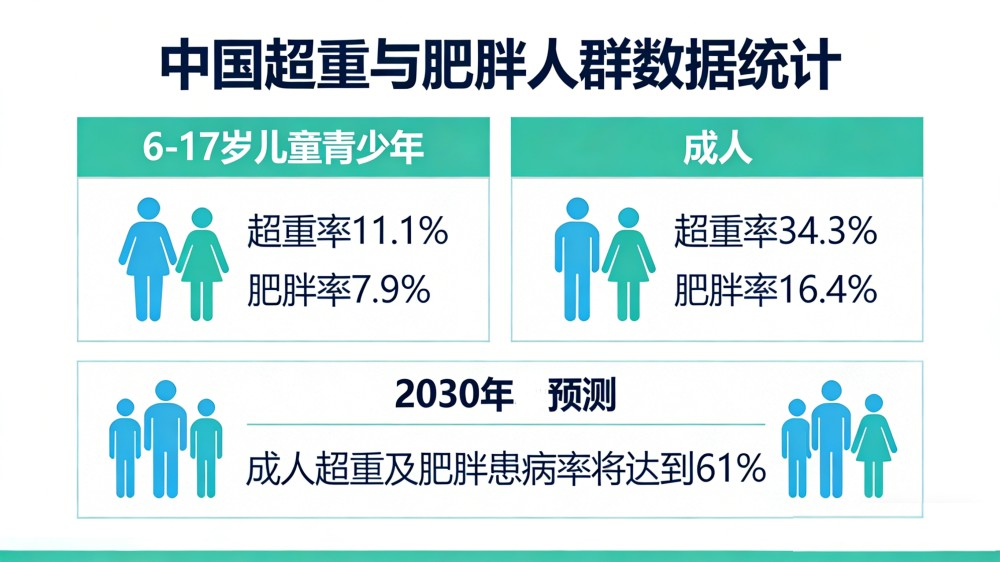 我國(guó)超重與肥胖人群的發(fā)病率、增長(zhǎng)速度均居世界首位。最新全國(guó)統(tǒng)計(jì)數(shù)據(jù)顯示:6-17歲兒童青少年:超重率11.1%、肥胖率7.9%;成人:超重率34.3%、肥胖率16.4%;預(yù)計(jì)到2030年,中國(guó)成人超重及肥胖患病率將達(dá)到61%。