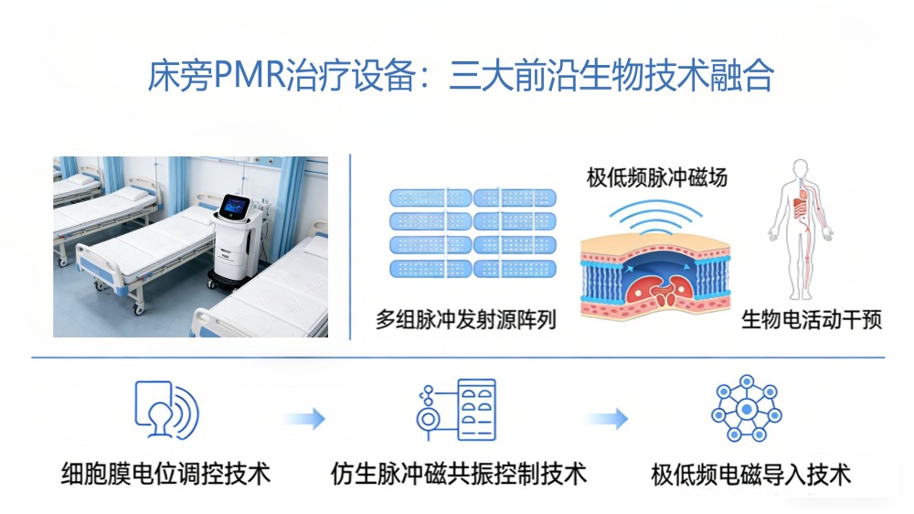 作為科技與醫(yī)療深度融合的產(chǎn)物,床旁PMR治療設(shè)備的誕生,打破了傳統(tǒng)康復(fù)治療的局限,其核心優(yōu)勢(shì)源于三大前沿技術(shù)的深度融合——細(xì)胞膜電位調(diào)控技術(shù)、仿生脈沖磁共振控制技術(shù)和極低頻電磁導(dǎo)入技術(shù),通過(guò)多組脈沖發(fā)射源陣列重組,設(shè)備可精準(zhǔn)發(fā)射極低頻脈沖磁場(chǎng),溫和作用于人體內(nèi)部,科學(xué)干預(yù)體內(nèi)生物電活動(dòng)。