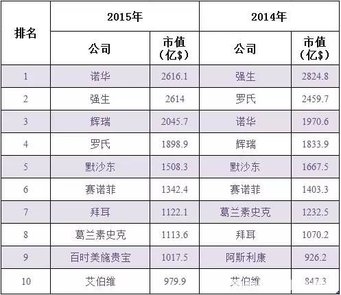 附:《2015年市值最高的10家制藥公司》