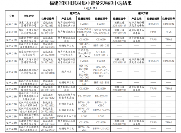 從中選結(jié)果可以看到,超聲刀類耗材擬中選企業(yè)包括強生、奧林巴斯、天津瑞奇、北京速邁以及武漢半邊天等械企;