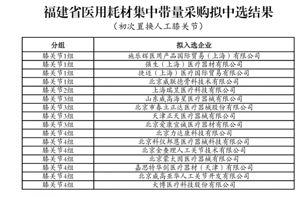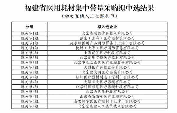初次置換人工全髖關(guān)節(jié)擬中選企業(yè)包括強生、施樂輝、捷邁、山東威高等械企;初次置換人工膝關(guān)節(jié)擬中選企業(yè)包括強生、捷邁、施樂輝、山東威高、大博醫(yī)療等械企;