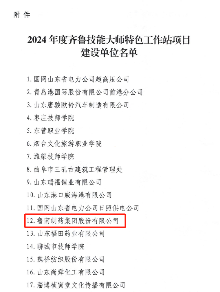 近日,山東省人力資源和社會保障廳發(fā)布《關(guān)于公布2024年度齊魯技能大師特色工作站項(xiàng)目建設(shè)單位的通知》,魯南制藥集團(tuán)股份有限公司獲批齊魯技能大師特色工作站。