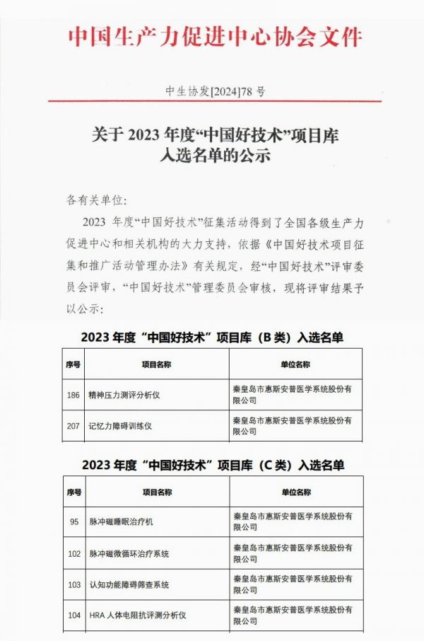 其中,惠斯安普自主研發(fā)的精神壓力評測分析儀、記憶力障礙訓(xùn)練儀兩款設(shè)備技術(shù)入選“中國好技術(shù)”項目庫(B類),被授予“中國好技術(shù)”稱號?;菟拱财杖梭w電阻抗評測分析儀、脈沖磁微循環(huán)治療儀、認知功能障礙篩查系統(tǒng)、脈沖磁睡眠治療機4項入選“中國好技術(shù)”項目庫(C類)。