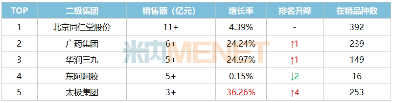 2024年Q1-Q3中成藥TOP5集團(tuán)大洗牌,廣藥集團(tuán)和華潤三九銷售額增長率均超過20%,排名各上升1位,而太極集團(tuán)則大漲36.26%,排名一口氣躍升了4位。