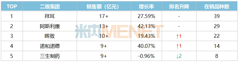 4家跨國藥企繼續(xù)牢牢守住領(lǐng)先地位,拜耳以17.5億元的銷售額穩(wěn)坐TOP1集團(tuán)寶座,暉致、諾和諾德各上升1位,而本土企業(yè)三生制藥排在TOP5。