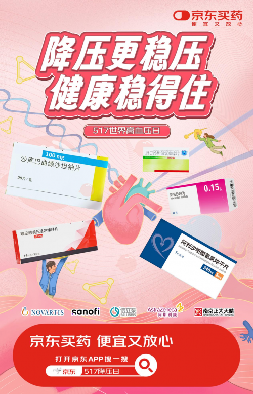 值此第21個世界高血壓日來臨之際,京東買藥攜手諾華制藥、賽諾菲、阿斯利康、深圳信立泰藥業(yè)股份有限公司、南京正大天晴制藥有限公司等多家國內(nèi)外知名藥企,共同發(fā)起“降壓更穩(wěn)壓,健康穩(wěn)得住”主題系列活動,旨在通過防治結(jié)合,助力公眾科學(xué)管理血壓。