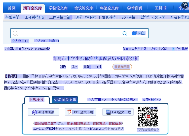 這篇論文發(fā)表于2024年7月第32卷第7期的《中國(guó)兒童保健雜志》上,標(biāo)題為《青島市中學(xué)生抑郁癥狀現(xiàn)況及影響因素分析》。論文研究者采用分層隨機(jī)抽樣的方法,于2019、2020年在山東省青島市所有區(qū)縣對(duì)7所學(xué)校的7765名中學(xué)生進(jìn)行問(wèn)卷調(diào)查,最終納入有效樣本7749名,其中男生4036人(52.08%),女生3713人(47.92%);初中生4365人(56.33%),高中生2883人(37.20%),職高生501人(6.47%)。