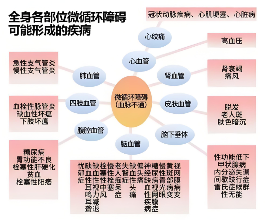 現(xiàn)代醫(yī)學(xué)研究表明,微循環(huán)障礙與200余種慢性疾病的發(fā)生、發(fā)展密切相關(guān)。以糖尿病為例,長期的高血糖狀態(tài)會損傷微血管內(nèi)皮細(xì)胞,導(dǎo)致血管壁增厚、管腔狹窄,引起微循環(huán)障礙。這不僅會影響足部的血液供應(yīng),導(dǎo)致糖尿病足等嚴(yán)重并發(fā)癥,還會對腎臟、視網(wǎng)膜等重要器官造成損害。心腦血管疾病也是如此,微循環(huán)障礙可導(dǎo)致血液黏稠度增加、血流速度減慢,容易形成血栓,增加心肌梗死、腦卒中等疾病的發(fā)病風(fēng)險(xiǎn)。此外,微循環(huán)障礙還與高血壓、高血脂、慢性疼痛、失眠、疲勞綜合征等多種慢性病息息相關(guān)。因此,改善微循環(huán)障礙,對于慢性病的防治具有重要意義。