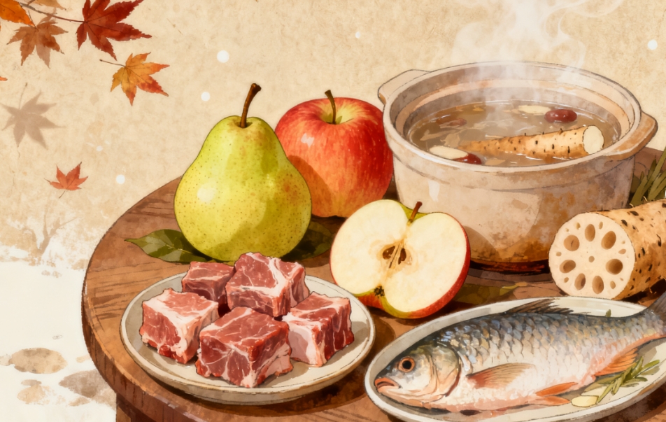 霜降是秋天的尾巴,每到這個時候,我們往往會感到更加干燥,很多人會出現(xiàn)口干、唇干、鼻干、咽干、皮膚干燥、大便干結(jié)等問題。這些都是因為燥邪耗傷津液導致的,所以建議以溫潤食材為主,兼顧防燥與御寒,如梨、蘋果、山藥、蓮藕等潤燥蔬果,搭配羊肉、魚肉等優(yōu)質(zhì)蛋白。減少寒性食物(如西瓜、苦瓜)和辛辣刺激物攝入,以防損傷脾胃。