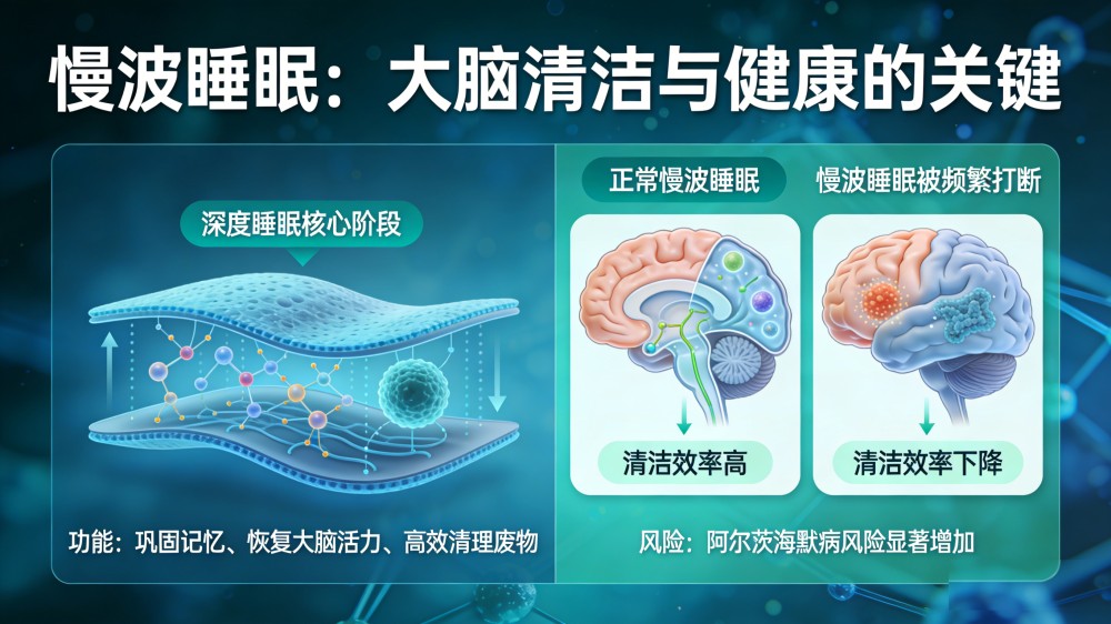 進(jìn)一步的研究更精準(zhǔn)地指出,慢波睡眠的減少,是阿爾茨海默病風(fēng)險(xiǎn)升高的重要信號(hào)。慢波睡眠作為深度睡眠的核心階段,不僅能幫助我們鞏固記憶、恢復(fù)大腦活力,更是大腦高效清理廢物的關(guān)鍵時(shí)期。當(dāng)慢波睡眠被頻繁打斷,大腦的“清潔效率”會(huì)大幅下降,有害物質(zhì)持續(xù)堆積,就會(huì)讓患阿爾茨海默病的風(fēng)險(xiǎn)顯著增加。
