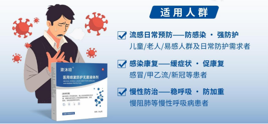 防治一體,適應(yīng)癥明確,滿足多元化需求——通過直接對上呼吸道進行噴入,保持上呼吸道濕潤,精準滯留于鼻咽部黏膜,從而阻止病原微生物在呼吸道內(nèi)生長繁殖。同時,有效舒緩流感引發(fā)的上呼吸道系統(tǒng)鼻塞、流涕、咳喘、呼吸受阻等癥狀,減輕患者痛苦。