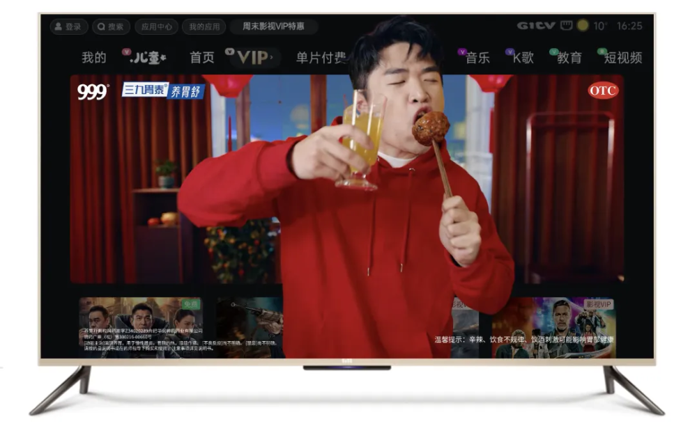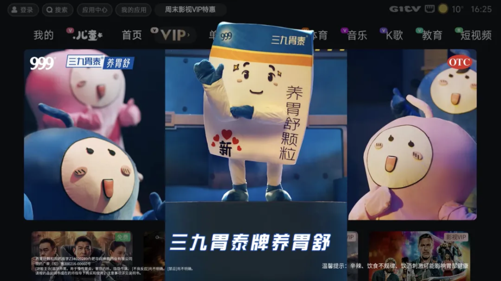 通過開機廣告強勢觸達、大視界廣告中心展示,OTT超大畫幅強視覺呈現(xiàn)使品牌信息形成全方位包圍式觸達,讓三九胃泰成為春節(jié)家庭健康的專屬 “守護者”,在情感共鳴中完成品牌價值的深度傳遞,盡顯醫(yī)藥大品牌的專業(yè)質(zhì)感,進一步夯實品牌公信力。