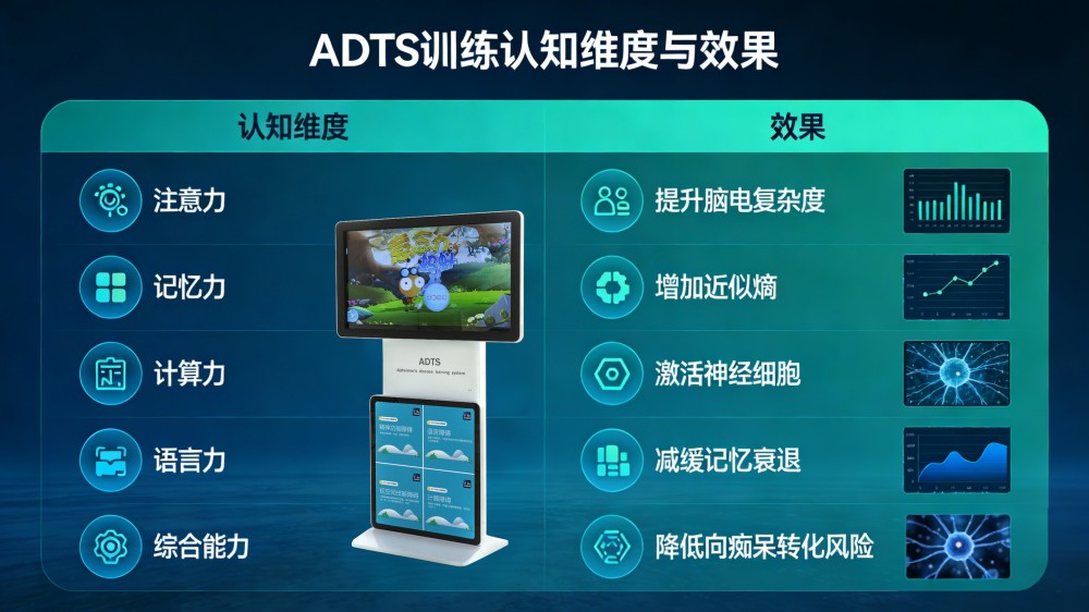 通過(guò)認(rèn)知功能障礙篩查設(shè)備的預(yù)警,及時(shí)、規(guī)范開(kāi)展認(rèn)知訓(xùn)練是延緩衰退的核心手段。ADTS記憶力障礙訓(xùn)練儀是專(zhuān)為早期干預(yù)輕度認(rèn)知障礙而設(shè)計(jì),應(yīng)用非侵入式腦機(jī)接口技術(shù),以意念控制游戲進(jìn)程的創(chuàng)新模式,打造高齡友好、趣味化、個(gè)性化的康復(fù)方案,填補(bǔ)傳統(tǒng)訓(xùn)練靶向性不足、依從性低的短板。ADTS訓(xùn)練覆蓋注意力、記憶力、計(jì)算力、定向力、語(yǔ)言力、綜合能力六大認(rèn)知維度,有效提升腦電復(fù)雜度與近似熵,激活神經(jīng)細(xì)胞,減緩記憶衰退,降低向癡呆轉(zhuǎn)化的風(fēng)險(xiǎn)。